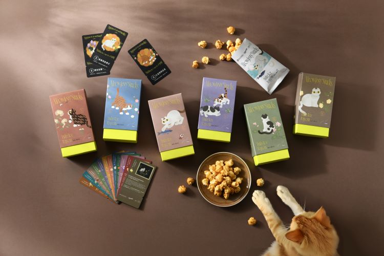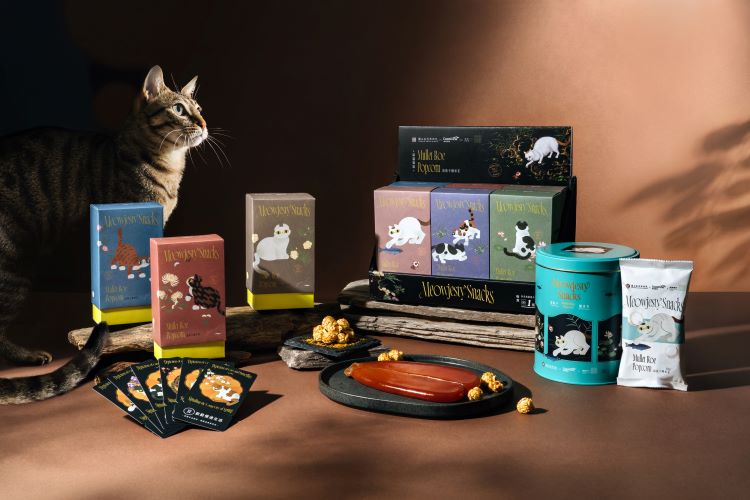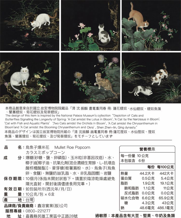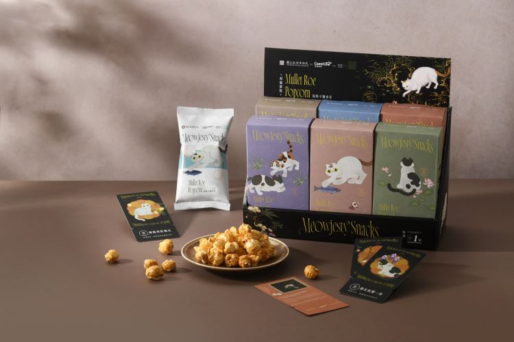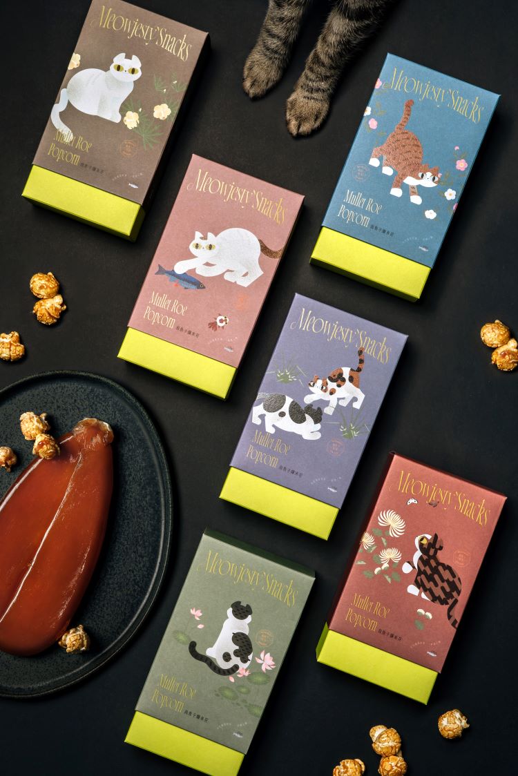 設計取材自清代沈振麟《畫耄耋同春冊》,結合現代貓奴文化設計包裝,香脆爆米花融合濃郁烏魚子風味,兼具藝術與美味,深受各年齡層喜愛。